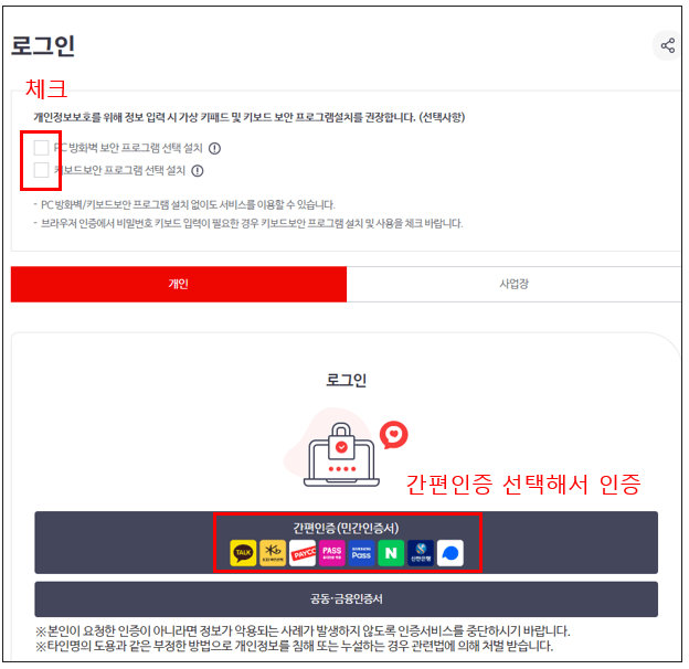 2. 로그인을 위해 간편인증서 중 편한 방법으로 선택하여 로그인을 합니다. 저는 카카오톡 인증을 하겠습니다.