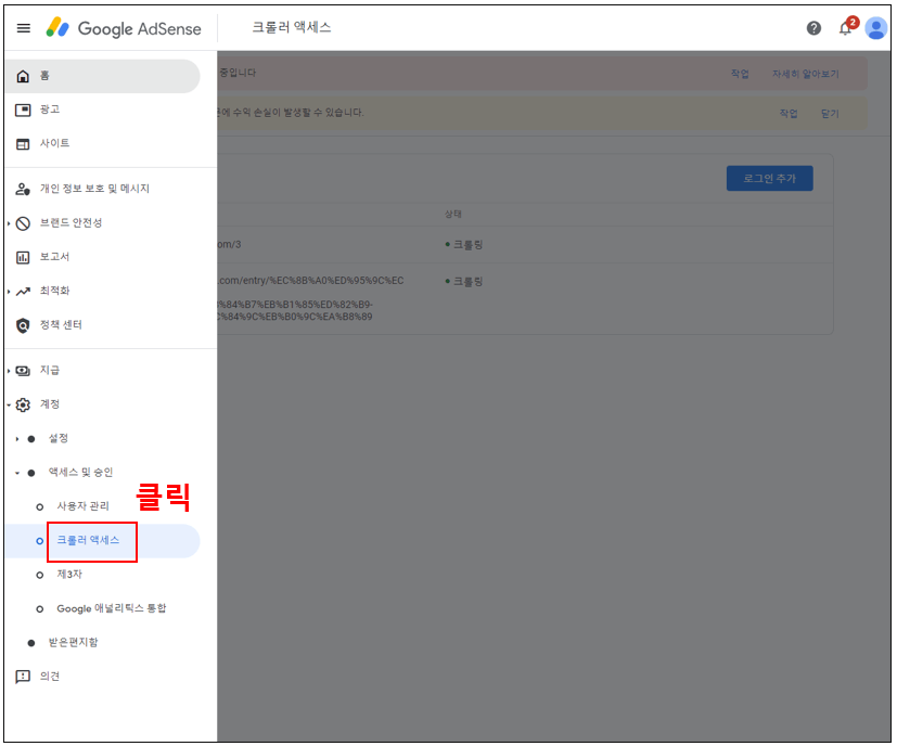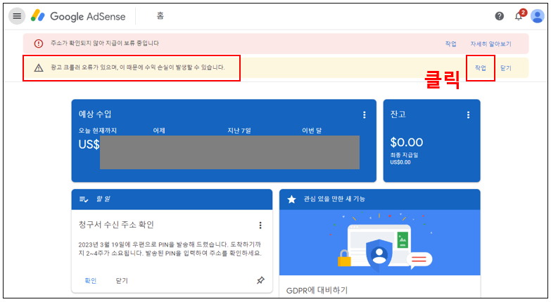 📌 애드센스 페이지에서 어느 순간 상단에 경고메시지인 "광고 크롤러 오류가 있으며, 이 때문에 수익 손실이 발생할 수 있습니다." 를 보신 적이 한번 쯤 있을 겁니다. 수익 손실부분때문에 빨리 해결해야 겠죠. 상단 우측에 [작업]링크를 클릭합니다.