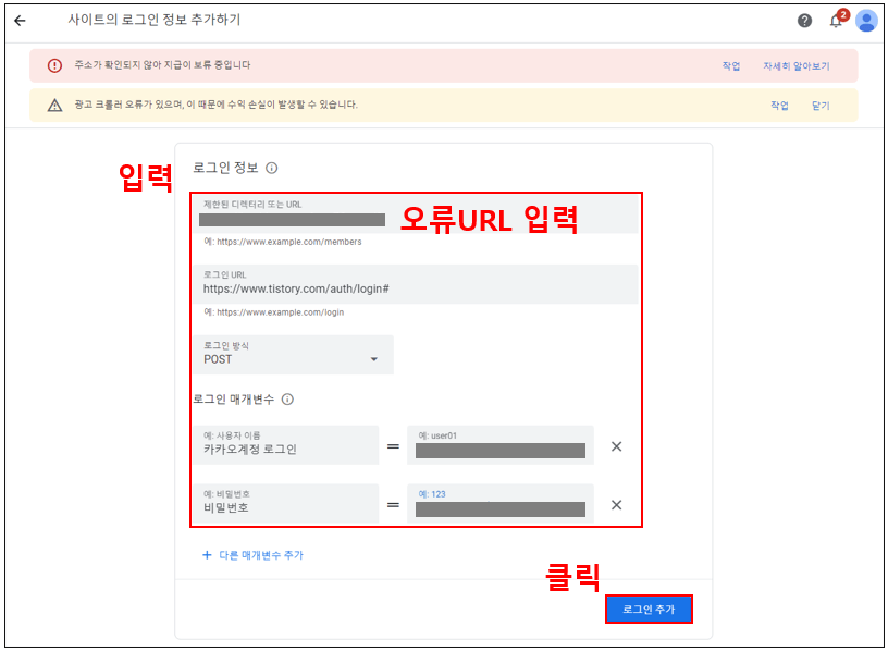 📌 좀 전에 문제되는 링크를 입력하고 티스토리 로그인 URL를 입력합니다. 그리고 로그인 방식은 POST로 선택 한 후 로그인 매개변수에 카카오계정 로그인과 우측에 실제 계정아이디 입력, 그리고 비밀번호와 우측에 실제 티스토리블로그 비밀번호를 입력합니다.