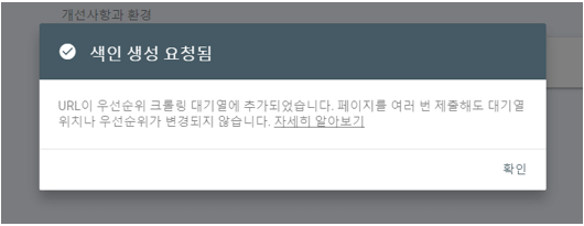 📌 그리고 아래 [색인 생성 요청] 링크를 클릭하면 요청 제출 중으로 뜨면서 1~2분 기다리시면 색인 생성 요청됨 이라는 팝업창이 뜨면서 작업이 완료됩니다.