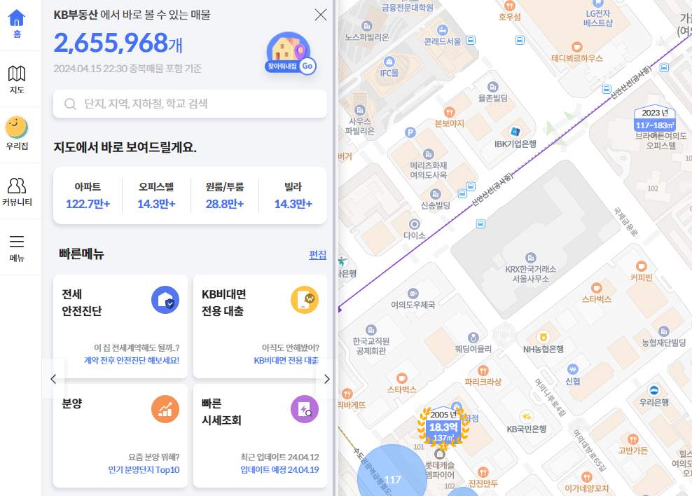 KB부동산은 KB국민은행이 제공하는 데이터를 기반으로 부동산 시세, 실거래가, 부동산 투자에 관한 유용한 정보들을 제공하고 있습니다.
