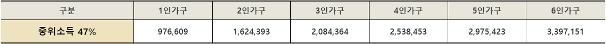 주거급여를 신청하기 위해서는 성별, 연령 상관없이 신청 가구의 소득과 재산을 고려하여 총 소득인정액이 중위소득의 47% 이하인 가구이면 신청가능합니다. 소득수준을 확인하기 위해서는 가구원 수에 따라 달라지는 아래 표를 참고하시기 바랍니다.