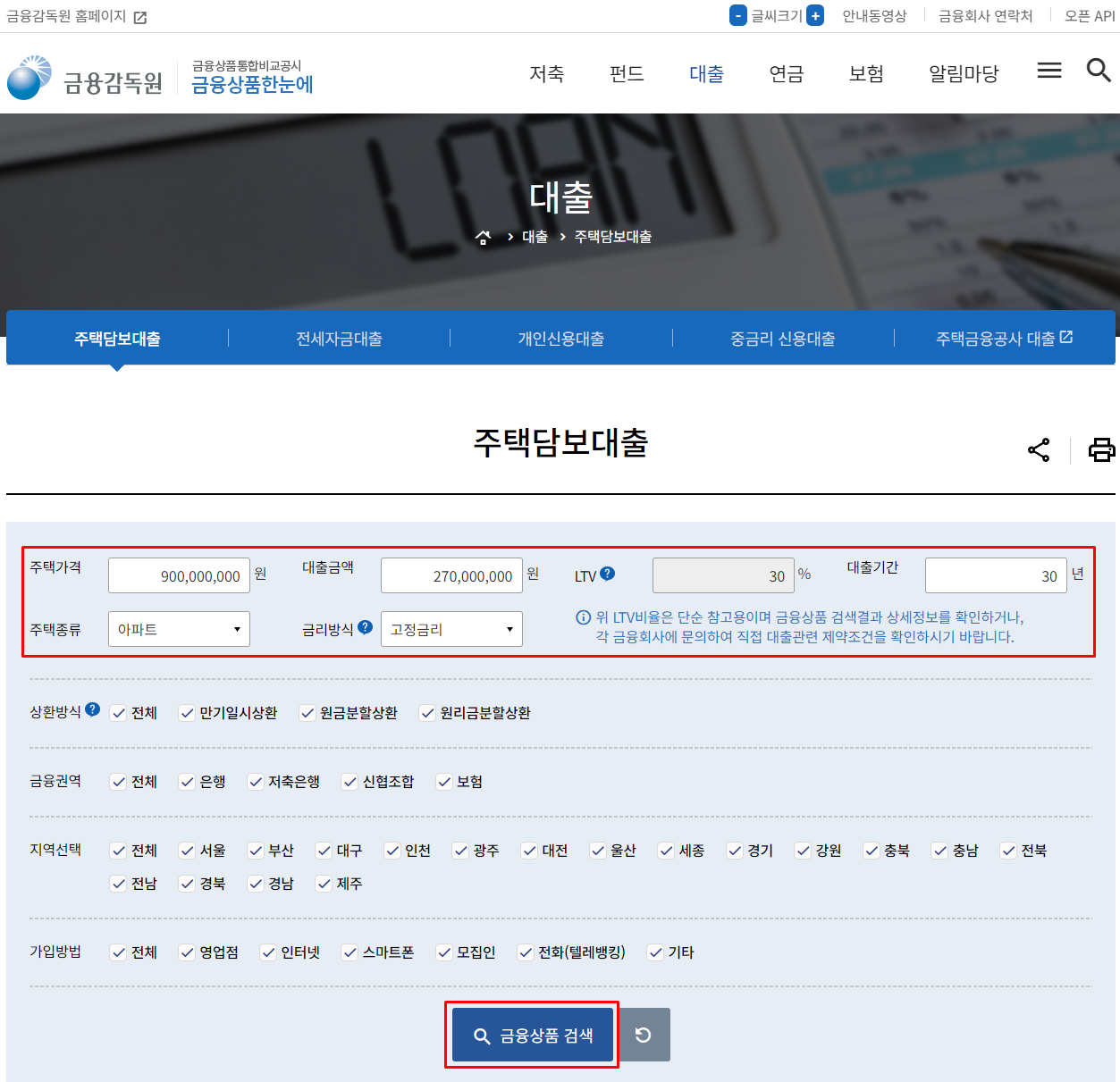 주택담보대출에서 주택가격, 대출금액, 대출기간, 주택종류, 금리방식을 입력하고, 상환방식, 금융권역, 지역, 가입방법 등을 선택해서 [금융상품검색] 을 클릭하면 최저금리의 금융상품을 조회할 수 있습니다.