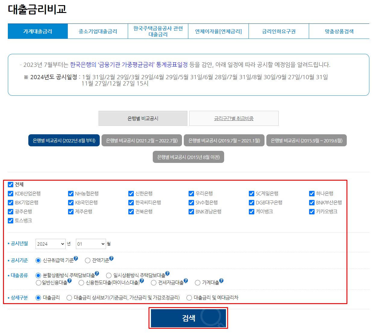 전국은행연합회에서 가계대출 금리조회할 수 있습니다. 신용점수별 금리를 확인가능하며, 은행별 대출종류별 상세구분을 선택 후 [검색] 하면 은행 및 CB사 신용점수별 금리, 평균 신용점수 등을 조회할 수 있습니다.