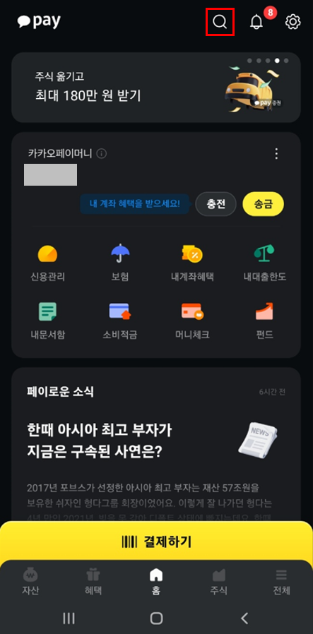 1. 카카오페이를 실행하여 우측 상단의 검색버튼을 클릭하여 "주택담보대출 받기"를 검색합니다. 검색된 "주택담보대출 받기" 서비스를 선택합니다.