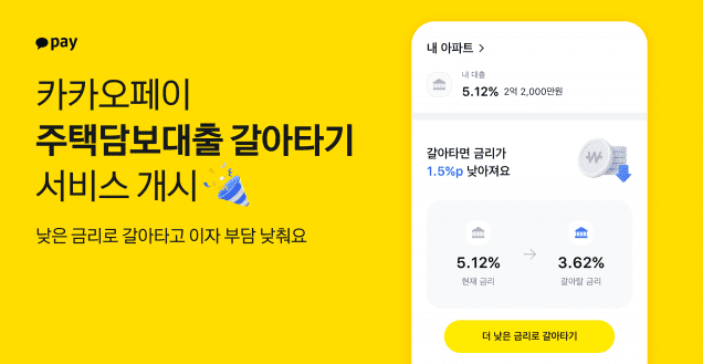 카카오페이에서 "주택담보대출 갈아타기" 서비스를 1월 9일에 출시했습니다. 시중은행과 지방은행, 인터넷뱅크, 보험사 등 11개의 금융사와 제휴를 맺고 사용자의 기존 대출, 거주 주택, 연소득 등을 입력하면 11개의 금융사에 최저 금리 순으로 금융상품을 1분이면 손쉽게 조회할 수 있습니다.