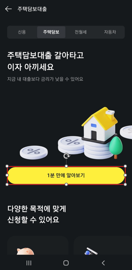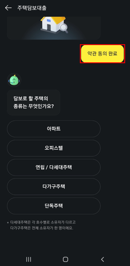2. 주택담보대출에서 [1분 만에 알아보기] 버튼을 터치하여 실행하고 약관에 동의합니다. 그리고 대화하듯이 챗봇이 물어보는 내용을 입력하거나 선택합니다. 거주 주택, 주소지 입력, 단독/공동 명의 선택, 대출목적(주택담보대출 갈아타기 등), 총 보유 주택수, 세입자 여부, 직업선택, 연소득 입력, 기존 대출 금액입력을 합니다.