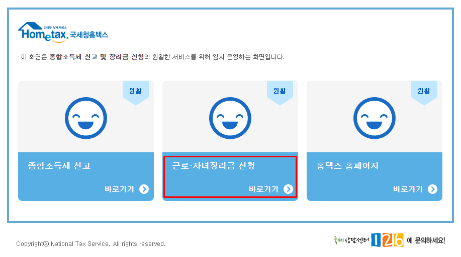 국세청 홈택스에 접속하셔서 [근로/자녀장려금 신청]을 선택하셔서 들어갑니다.