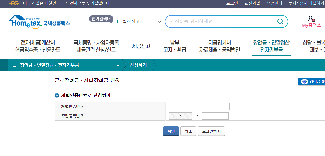 * 홈택스 로그인 → 장려금ㆍ연말정산ㆍ전자기부금 → 근로ㆍ자녀장려금 정기신청 → 신청하기